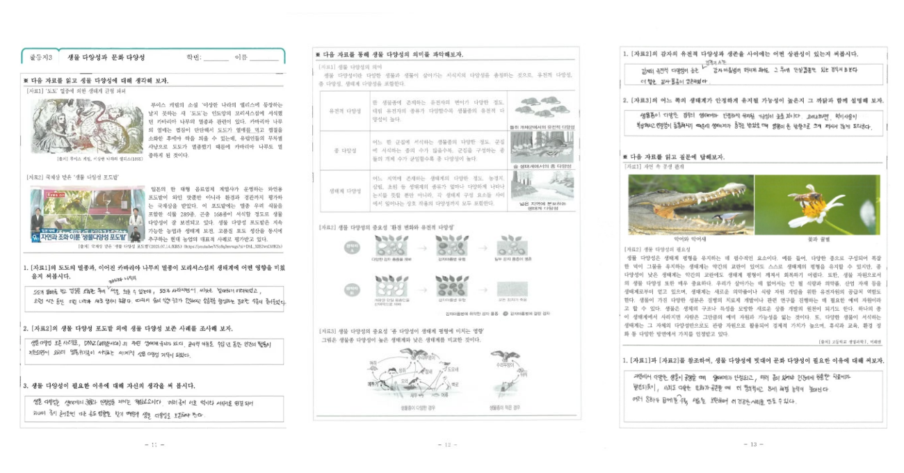 이전에 없던 새로운 수업을 시작하는 날은 아직도 조금 긴장이 됩니다. 이번 수업은 유독 그랬습니다. 6차시 동안 진행될 수업을 간략히 안내한 뒤, 교사의 개입을 최소화하고 학생들이 스스로 또는 옆자리 친구와 함께 탐구하며 답을 찾도록 했습니다. 2차시에 진행된 생물 다양성 수업은 생물 선생님의 도움을 받아 내용과 방식의 감수를 거쳤고, 오류 없이 진행하기 위해 노력했습니다.