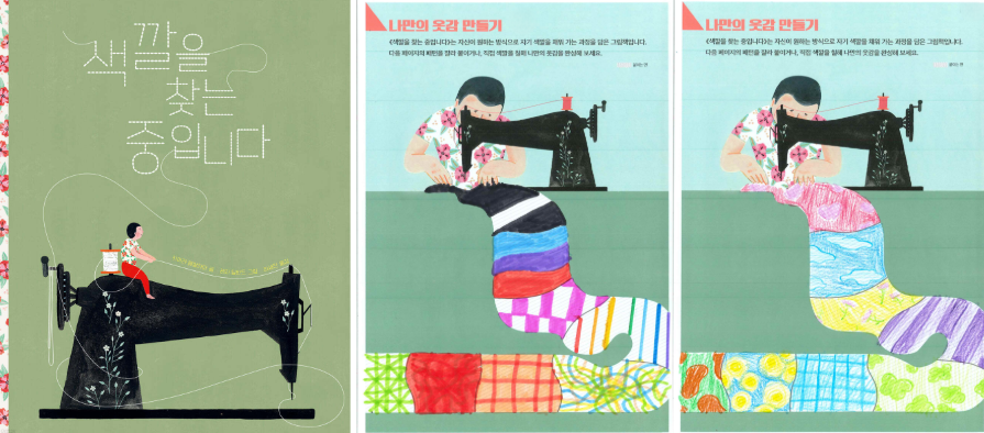 다음 활동으로는 그림책 <색깔을 찾는 중입니다>를 꺼냈습니다. 이 책은 성역할 고정관념에서 벗어난 취향을 지닌 주인공이 자신이 정말 좋아하는 것을 찾아가는 여정을 다루고 있습니다. 아이들은 주인공이 다양한 천을 잇고 꿰매며 ‘자신만의 색’을 만드는 장면을 보며, ‘차이’가 곧 아름다움이 될 수 있음을 자연스럽게 받아들였습니다. 마지막에는 주인공처럼 나만의 옷감 패턴을 만들어보며 다양성이 주는 자유로움과 아름다움을 직접 느낄 수 있도록 했습니다.