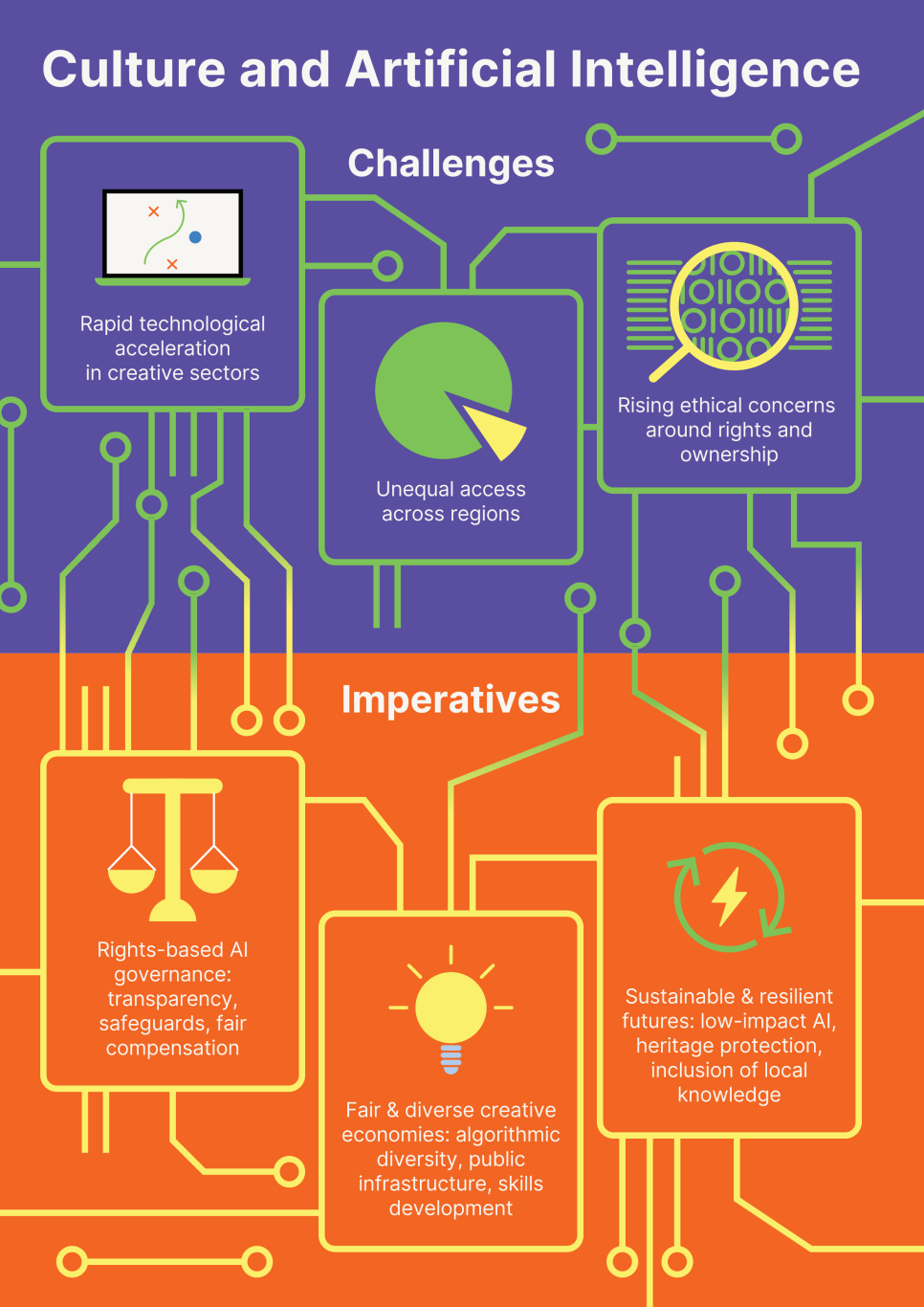 보고서는 AI가 이미 문화의 창작·유통·보존 방식을 근본적으로 변화시키고 있다고 밝히고 있다. AI는 접근성을 확장하고 유산을 보호하며 다양한 목소리를 증폭하는 등 창작의 새로운 가능성을 열어주고 있다. 그러나 동시에 불평등을 심화시키고 편향을 강화하며 문화의 획일화를 가속하고, 환경적 부담까지 증가시킬 수 있다는 점을 우려한다. 이러한 문제 인식을 바탕으로 보고서는 다음과 같은 핵심 도전 과제를 제시한다.