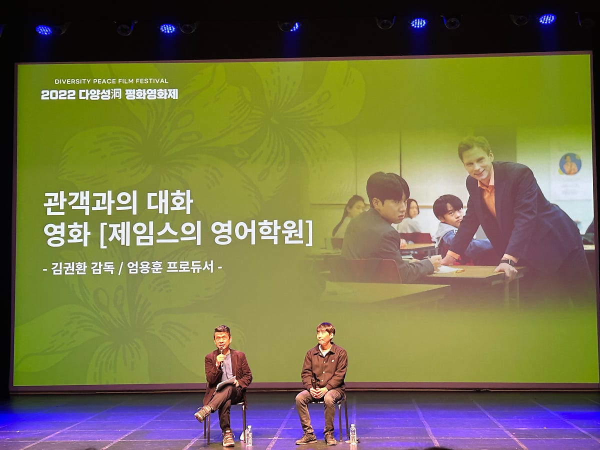 상영이 끝난 뒤 이 영화의 감독이신 김권환 감독님과 염용훈 프로듀서님께서 관객과의 대화를 진행해주셨습니다. 오픈 카카오톡을 통해 질문을 받고 <제임스의 영어학원> 전반과 김권환 감독의 영화 철학, 전작 등에 관한 이야기를 나누었습니다.