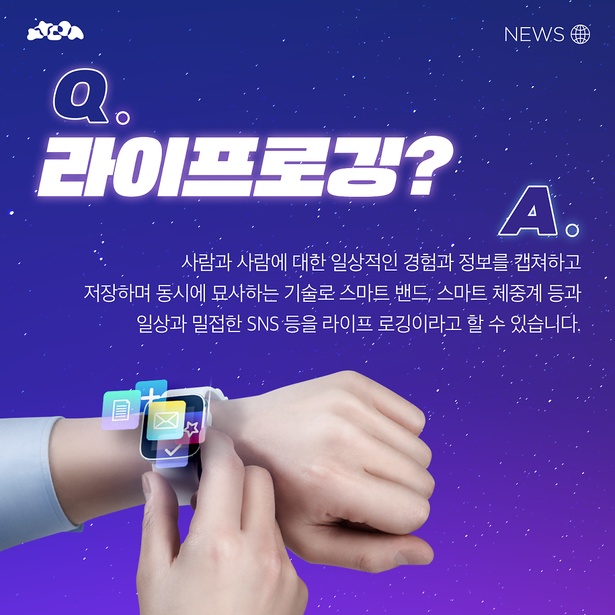 A. 사람과 사람에 대한 일상적인 경험과 정보를 캡쳐하고 저장하며 동시에 묘사하는 기술로 스마트 밴드, 스마트 체중계 등과 일상과 밀접한 SNS 등을 라이프로깅이라고 할 수 있습니다.