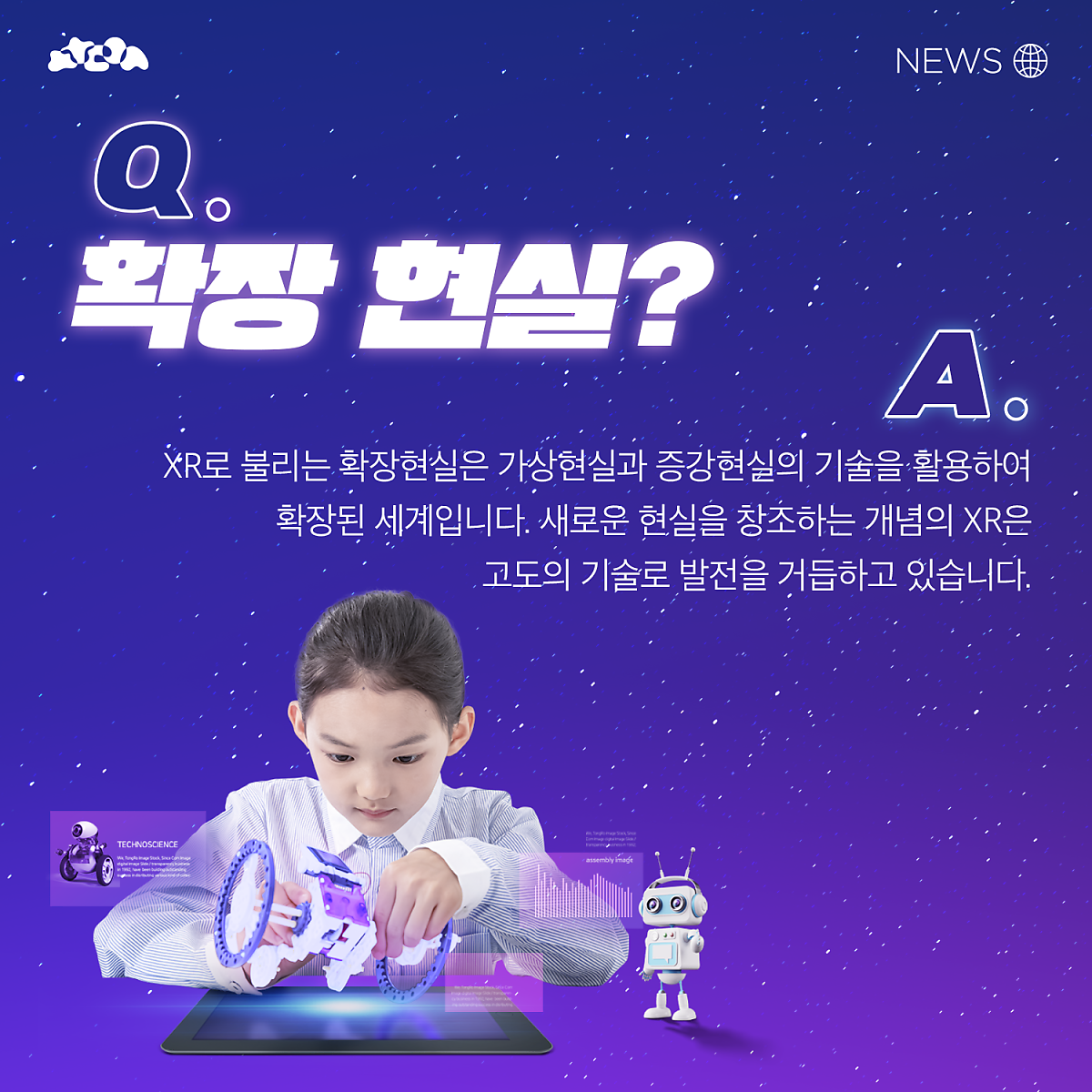 A. XR로 불리는 확장현실은 가상현실과 증강현실의 기술을 활용하여 확장된 세계입니다. 새로운 현실을 창조하는 개념의 XR은 고도의 기술로 발전을 거듭하고 있습니다.