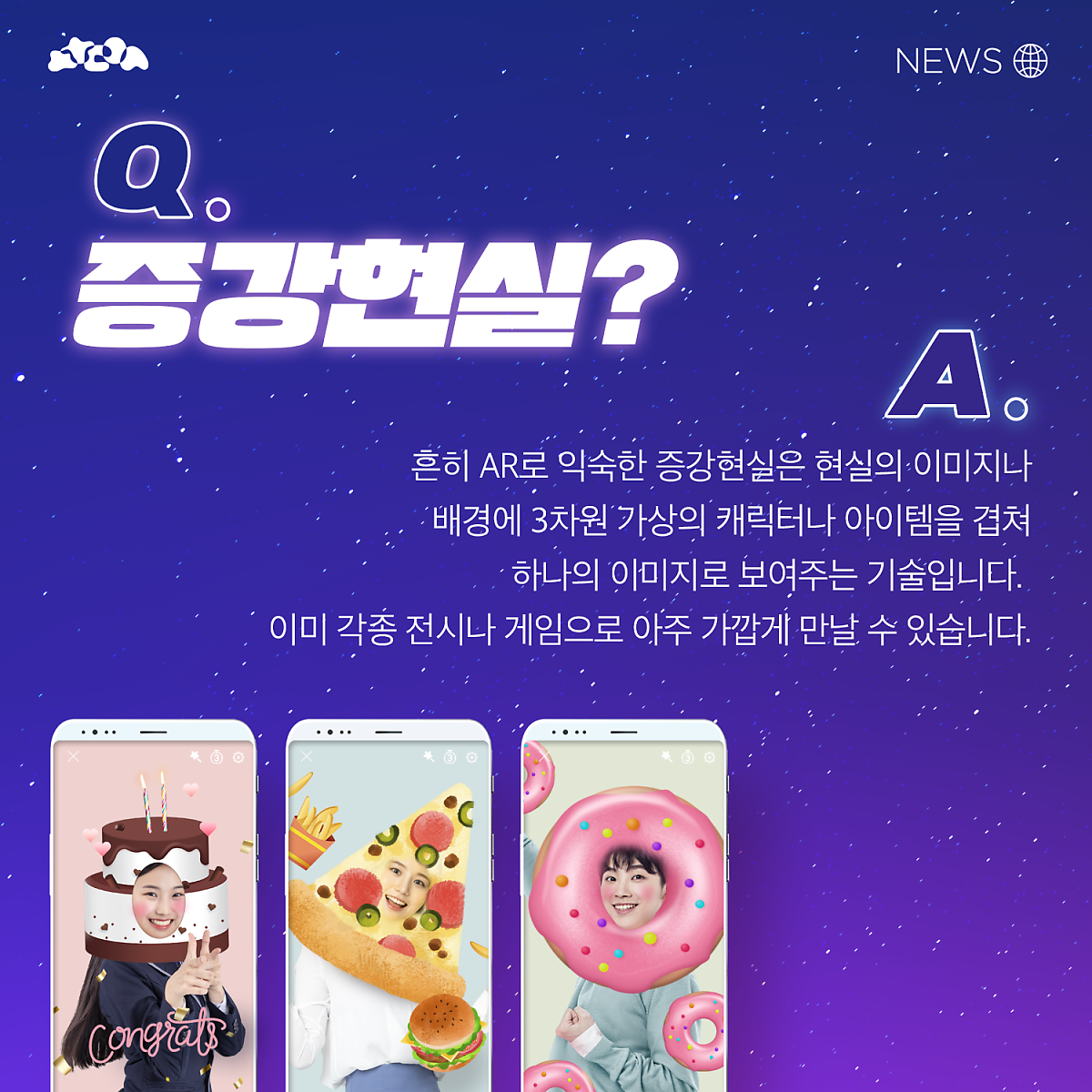 A. 흔히 AR로 익숙한 증강현실은 현실의 이미지나 배경에 3차원 가상의 캐릭터나 아이템을 겹쳐 하나의 이미지로 보여주는 기술입니다. 이미 각종 전시나 게임으로 아주 가깝게 만날 수 있습니다.