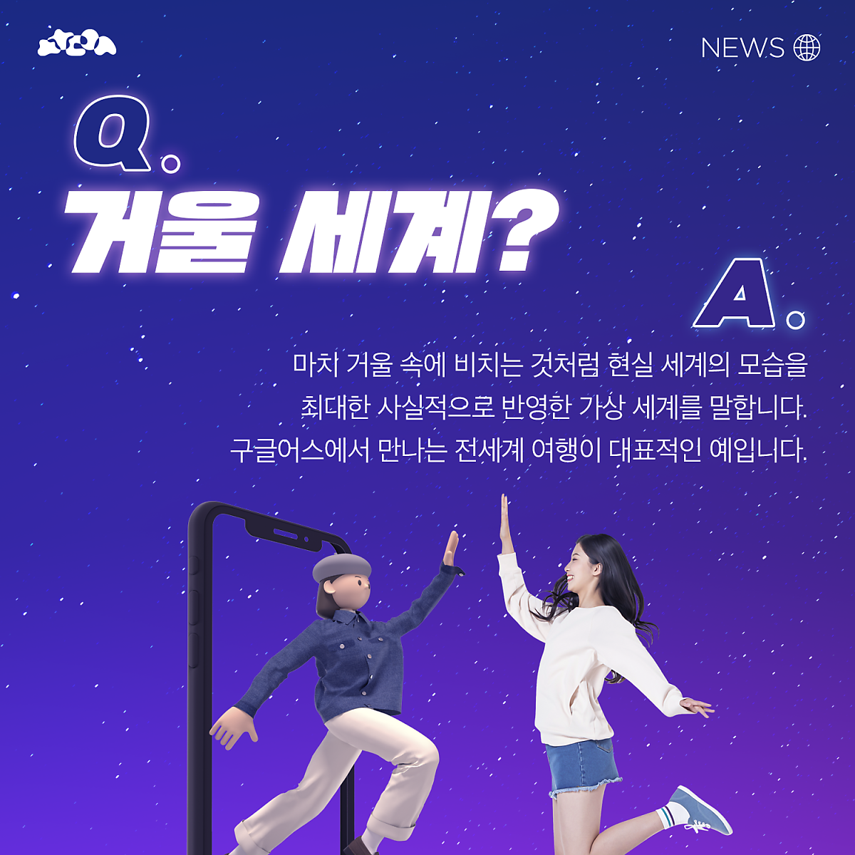 A. 마치 거울 속에 비치는 것처럼 현실 세계의 모습을 최대한 사실적으로 반영한 가상 세계를 말합니다. 구글어스에서 만나는 전세계 여행이 대표적인 예입니다.
