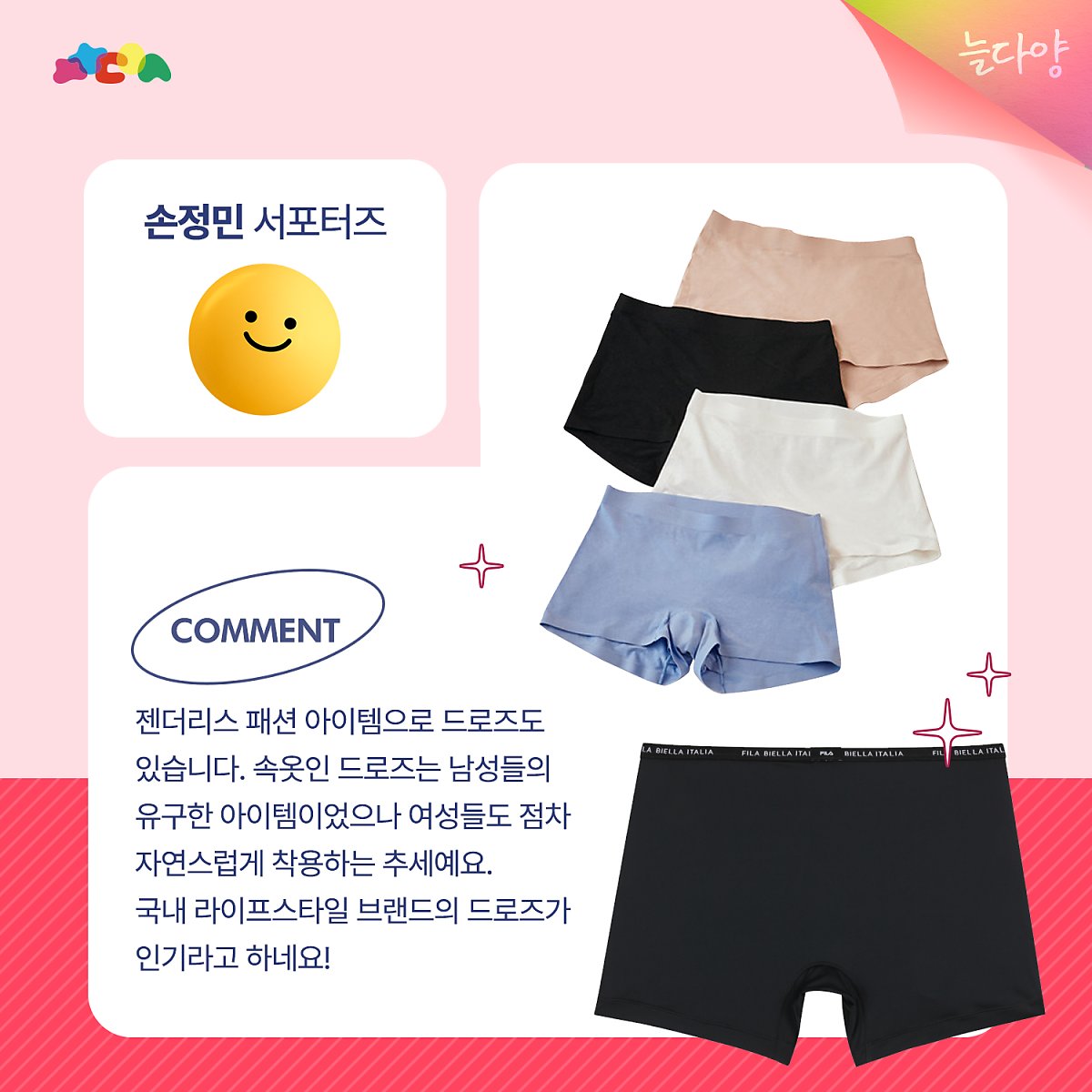 한국은 특히 오랜 기간 젠더리스 아이템을 반기지 않았다. 옷 선택의 기준에 있어 남성과 여성의 차이가 뚜렷한 것이 그 원인 중 하나였다. 남성은 착용 시 옷의 기능성과 편안함에, 여성들은 옷의 라인 등 스타일에 주로 더 집중해왔다. 드로즈는 몸에 잘 밀착되면서도 편안하고 통풍이 잘 된다는 장점이 있다. 이처럼 기능성과 편안함을 모두 갖춘 덕에 인기가 많다. 한 국내 라이프스타일브랜드에서 여성용 드로즈는 여성용 팬티 카테고리 판매 1위를 차지할 만큼 높은 판매율을 기록했다. 점차 늘어나는 드로즈에 대한 수요와 인기를 확인할 수 있는 대목이다.