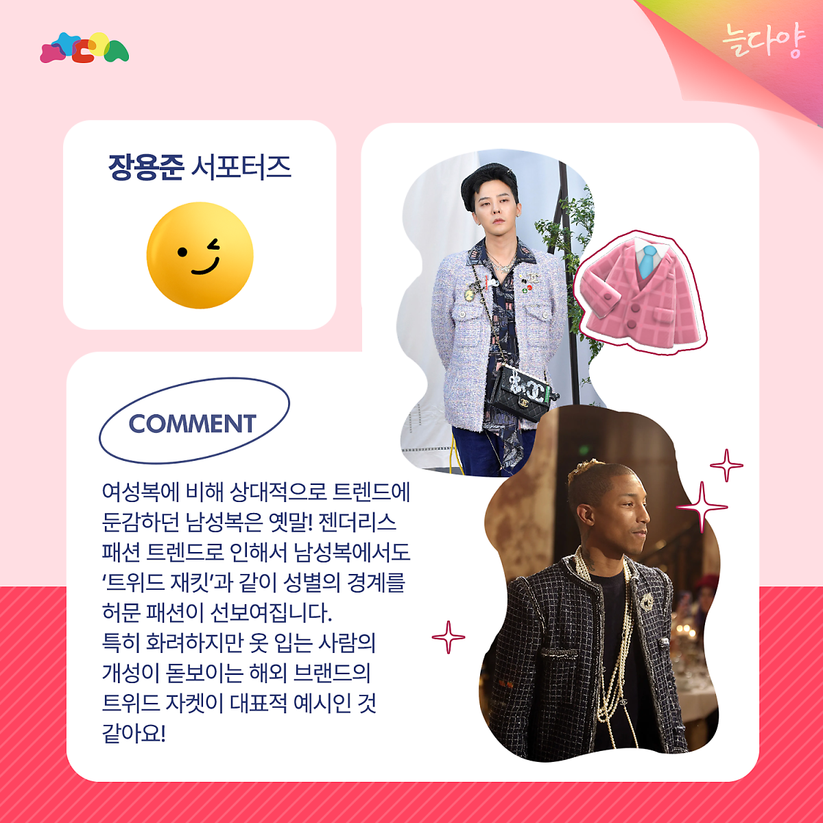 트위드 자켓 - tweed의 어원은 tweedle로 ‘뒤틀다/꼬다’라는 의미로 거칠고 두꺼운 모직천을 이용해서 뒤틀고 꼬는 방식으로 만든 재킷이다. 이전부터 트위드 자켓은 여성복에서 대개 여러가지 색을 사용해서 창살무늬, 삼능 무늬 등으로 포인트를 주는 재킷이었는데 2015년 어느 패션쇼에서 지드래곤이 여성 트위드 자켓을 착용하고 패션쇼에 등장하면서 국내 아이돌부터 일반인들까지 수많은 남성들이 봄, 가을에 트위드 자켓을 착용하는 것을 심심치 않게 볼 수 있다. 이처럼 여성들의 아우터로 쓰이던 ‘트위드 자켓’은 최근 성별에 구애 받지 않고, ‘나다움’을 나타내는 젠더리스 패션으로 유행되고 있다.