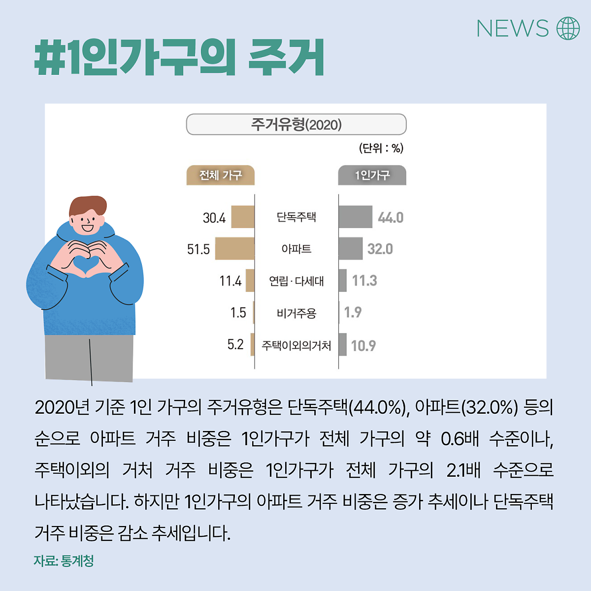 (32.0%) 등의 순으로 아파트 거주 비중은 1인가구가 전체 가구의 약 0.6배 수준이나, 주택이외의 거처 거주 비중은 1인가구가 전체 가구의 2.1배 수준으로 나타났습니다.. 하지만 1인가구의 아파트 거주 비중은 증가 추세이나 단독주택 거주 비중은 감소 추세입니다.