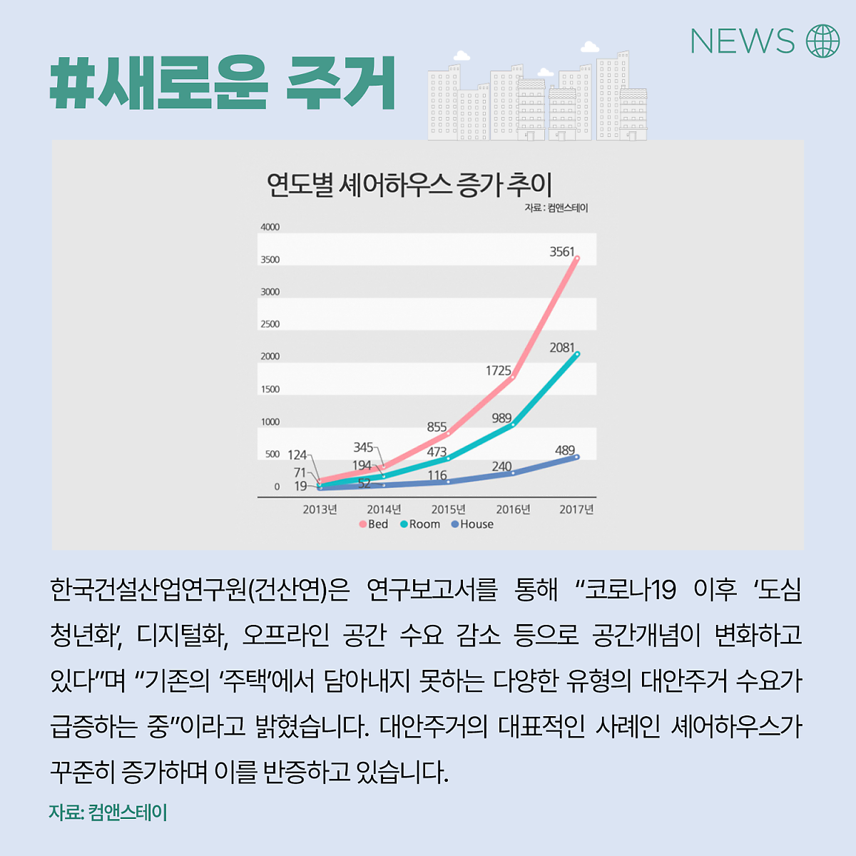 한국건설산업연구원(건산연)은 연구보고서를 통해 “코로나19 이후 ‘도심 청년화’, 디지털화, 오프라인 공간 수요 감소 등으로 공간개념이 변화하고 있다”며 “기존의 ‘주택’에서 담아내지 못하는 다양한 유형의 대안주거 수요가 급증하는 중”이라고 밝혔습니다. 대안주거의 대표적인 사례인 셰어하우스가 꾸준히 증가하며 이를 반증하고 있습니다.