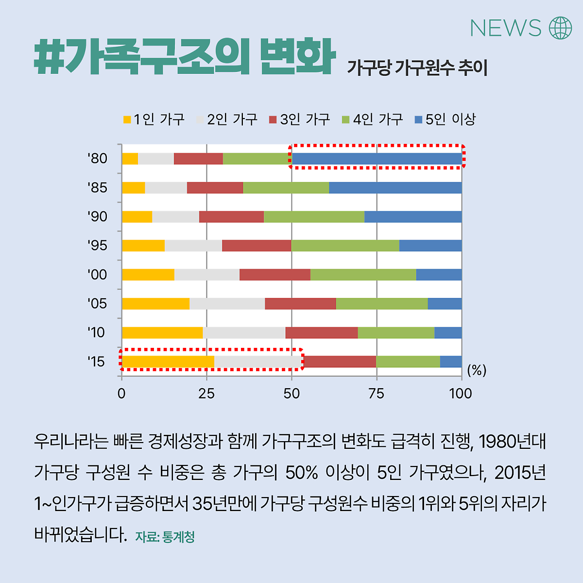 우리나라는 빠른 경제성장과 함께 가구구조의 변화도 급격히 진행, 1980년대 가구당 구성원 수 비중은 총 가구의 50% 이상이 5인 가구였으나, 2015년 1~