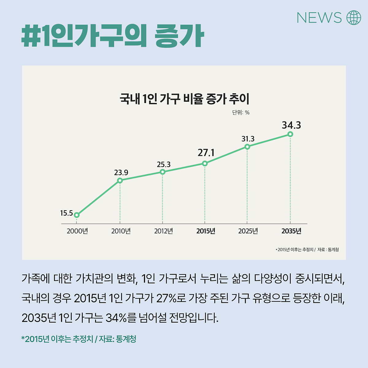 가족에 대한 가치관의 변화, 1인 가구로서 누리는 삶의 다양성이 중시되면서, 국내의 경우 2015년 1인 가구가 27%로 가장 주된 가구 유형으로 등장한 이래, 2035년 1인 가구는 34%를 넘어설 전망입니다.