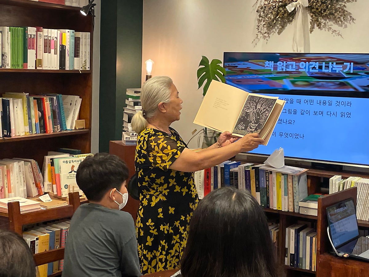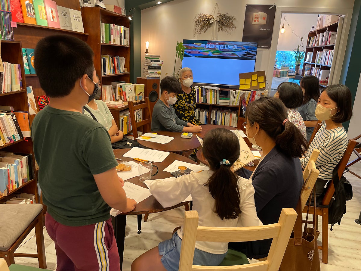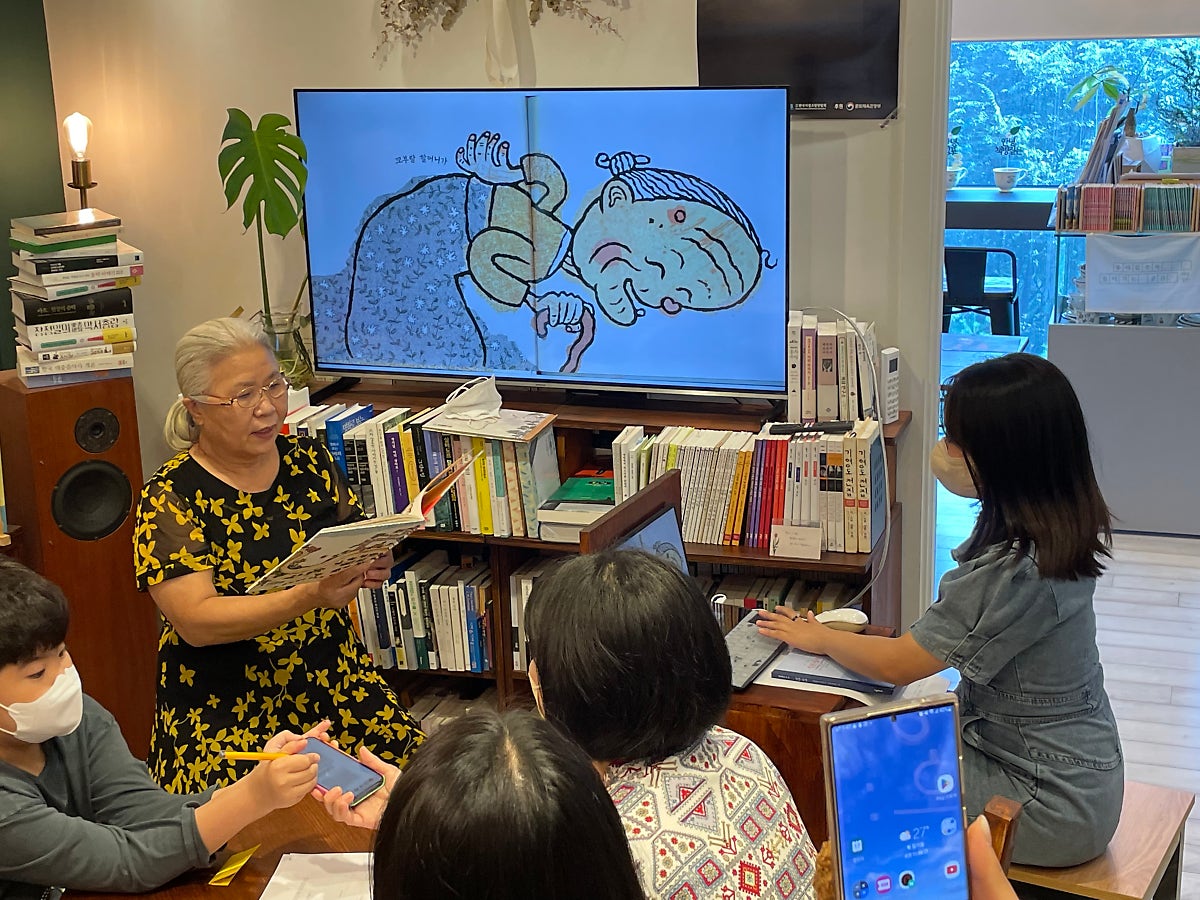‘경희씨가 책을 읽어줘요’라는 수업은 말 그대로 외할머니인 경희씨가 손녀 재희 양에게 책을 읽어주는 형식으로 수업이 진행되었습니다. 할머니가 책을 읽어주면 재희 양이 참여자들에게 해당 책에 대한 특정 부분을 짚어서 토론을 진행했습니다.
