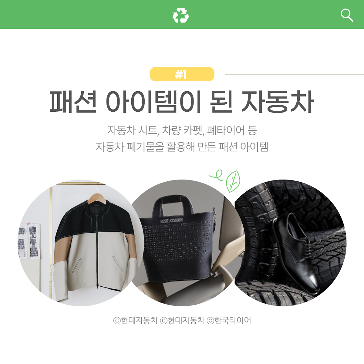 자동차 시트, 차량 카펫, 폐타이어 등 자동차 폐기물을 활용해 만든 패션 아이템