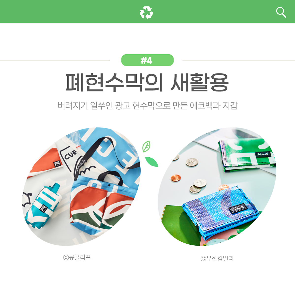 버려지기 일쑤인 광고 현수막을 활용한 에코백과 지갑