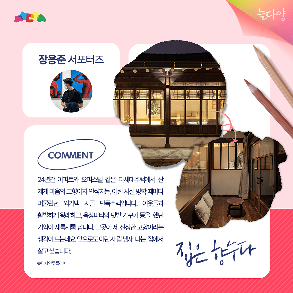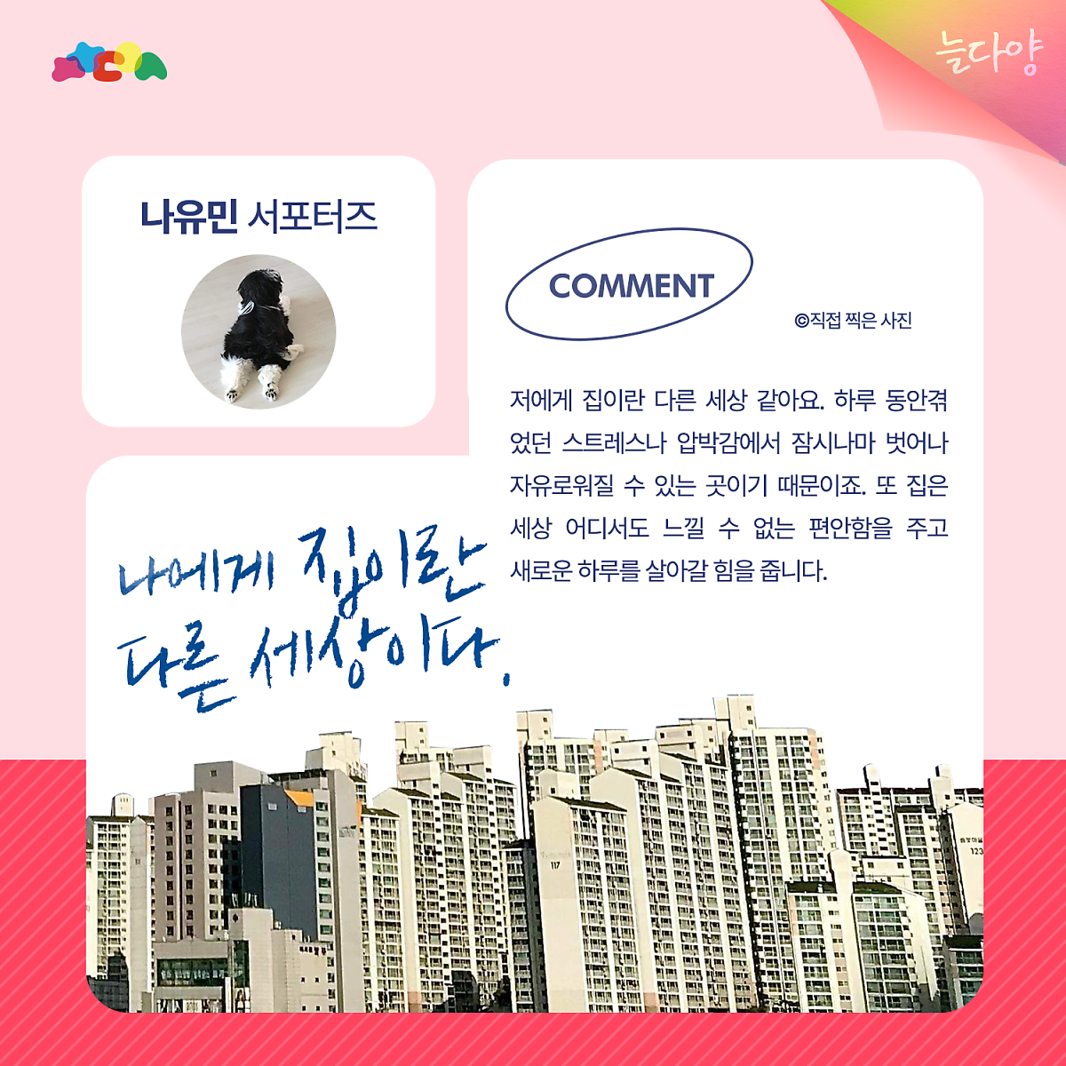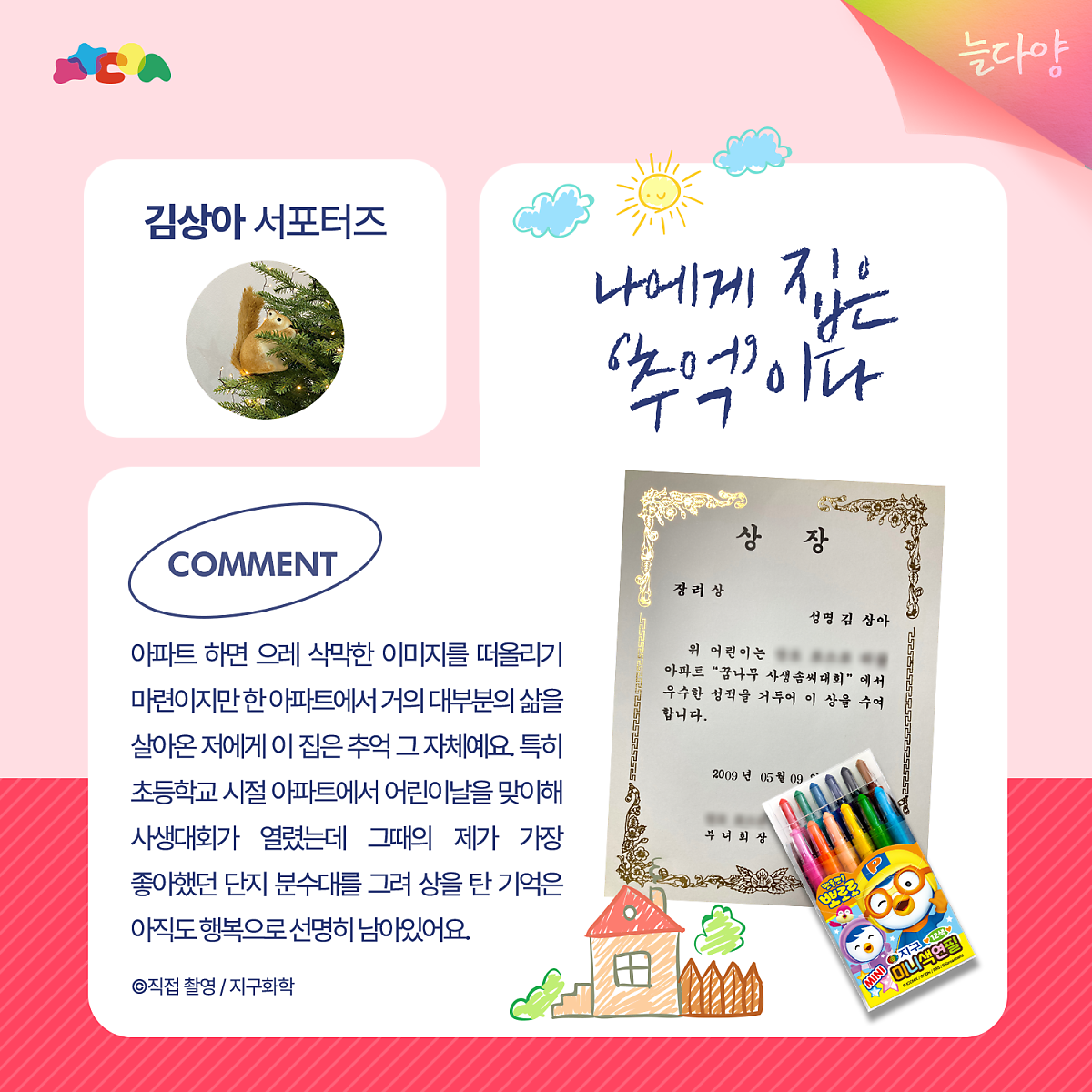 이렇게 어렸을 적 아파트에서의 행복했던 순간들을 회상해 보니 사람이 집에 의미를 부여하는 데에는 집의 형태보다도 그 안에서의 소통과 추억이 큰 역할을 한다는 사실을 깨닫는다. 행복했던 여러 추억과 인연에 감사하며, 지금 아파트에서 성장기를 보내는 어린이 친구들에게 이곳이 차가운 집의 기억으로 남지 않도록 앞으로는 나 역시 따뜻한 인사라도 건네야겠다는 다짐을 덧붙여본다!