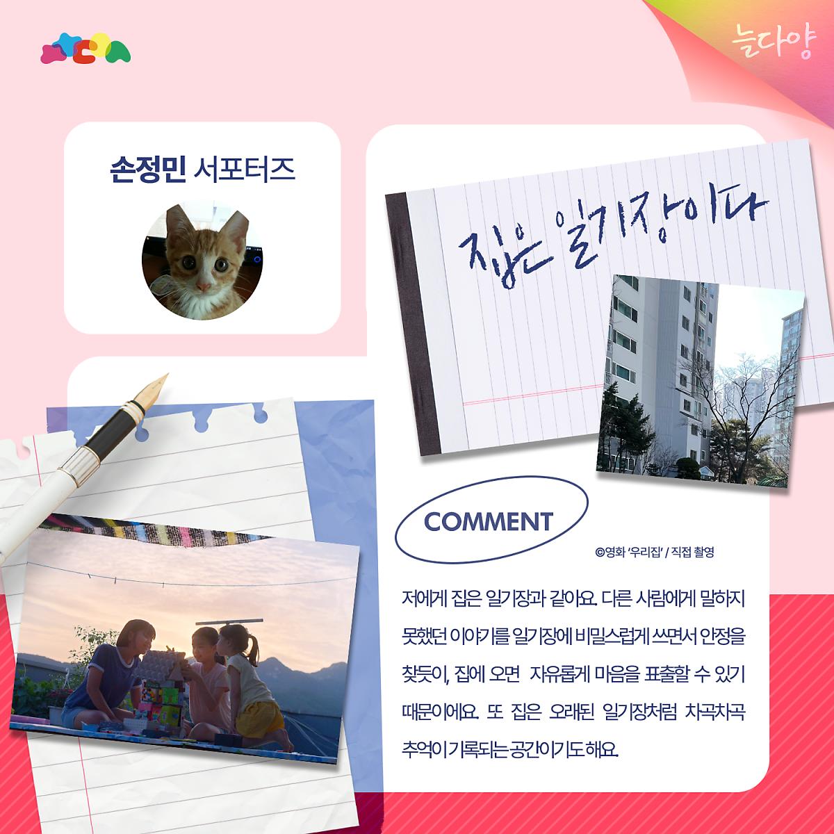 영화 <우리집>의 인물들은 자신들의 소중한 집을 끝까지 지켜내려고 노력한다. 사실 나는 내 집을 너무나도 소중하게 여기고 있다. 마음속 이야기를 쏟아낼 수 있는 일기장처럼 나는 슬프고 아픈 감정을 아무도 없는 집 베란다에 가서 쏟아냈다. 다른 동,호수의 아파트에 거주하는 친구들을 초대하여 생일파티를 열고 실컷 놀기도 했다. 내 인생에서 흐른 시간의 흔적은 내 집, 아파트에 흐릿할지라도 남아있었다. 언젠가 나는 집을 떠나야 할 시간이 찾아올지도 모른다. 그렇지만 오래된 일기장처럼 우리 집을 추억하며 나 혼자만 알 수 있는 기록을 해둘 일기장과 같은 집을 찾아 떠날 것이다.