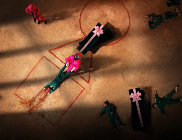 서바이벌 데스 게임이라는 무거운 장르임에도 전래놀이라는 단순한 놀이 방식을 도입함으로써 국적을 초월하여 보편적으로 전 세계인들의 유년기 추억 놀이의 향수를 자극한 것이다.