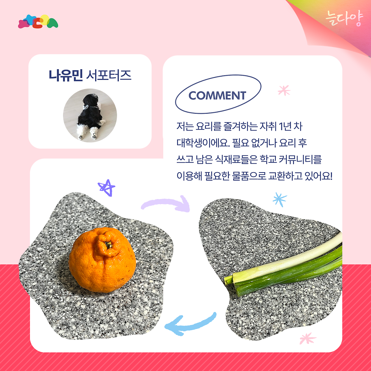 그러다 우연히 학교 커뮤니티에서 '감자가 많이 남아 사과와 교환하고 싶다'는 글을 보게 되었고 나도 교환을 하기 시작했다. 첫 번째로는 냉장고 안에 숨어있던 야채와 비누를 교환했다. 버려지는 음식물도 없었고 필요한 물품을 얻기 위해 비용을 지불 할 필요도 없었다. 두 번째로는 단순한 교환을 넘어 혼자 구매하기 부담스러운 식자재를 같이 구매해 소분했다. 버려지는 음식과 돈 낭비 없이 적절한 양에 적당한 가격으로 합리적인 소비를 했다는 생각에 온종일 뿌듯했다. 이렇게 '푸드 쉐어링'을 통해 버려지는 음식물을 줄이고 돈도 아낄 수 있음을 몸소 경험했다. 이제 냉장고 한편을 차지했던 필요 없는 식재료들과는 안녕이다!