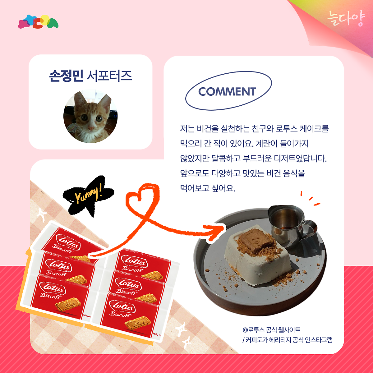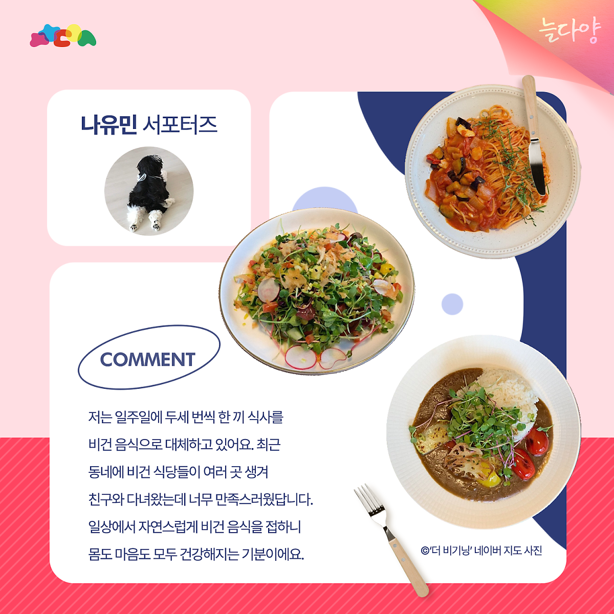 나는 이 경험을 계기로 내 일상에 존재하는 논비건 음식을 비건 음식으로 더 많이 대체하기 위해 노력하기로 다짐했다. 또한 주변 사람들에게도 비건을 추천할 의사가 더욱 커졌다. 특히 비건을 처음 접하는 사람들에게 ‘비건 식당’을 꼭 추천해주고 싶다. 아마도 비건에 대한 편견과 오해를 없애줄 큰 경험이 되어줄 것이다.
