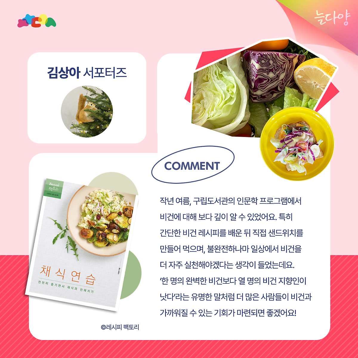 ‘한 명의 완벽한 비건보다 열 명의 비건 지향인이 낫다’라는 유명한 비건 명언처럼 더 많은 사람들이 육류 소비를 조금씩 줄여나가고 각자의 삶에서 불완전한 채식의 비율을 늘려갈 수 있다면 좋겠다. 내게 그러한 기회가 되어준 것이 도서관 프로그램이었던 만큼, 공공차원에서의 비건 배움의 장 역시 늘어나기를 바라본다.