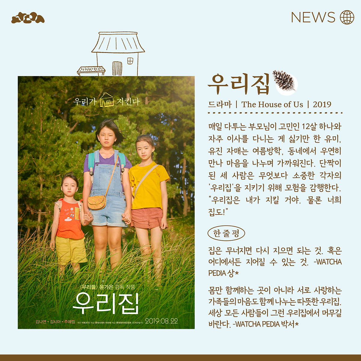 몸만 함께하는 곳이 아니라 서로 사랑하는 가족들의 마음도 함께 나누는 따뜻한 우리집. 세상 모든 사람들이 그런 우리집에서 머무길 바란다. –WATCHA PEDIA 박서*