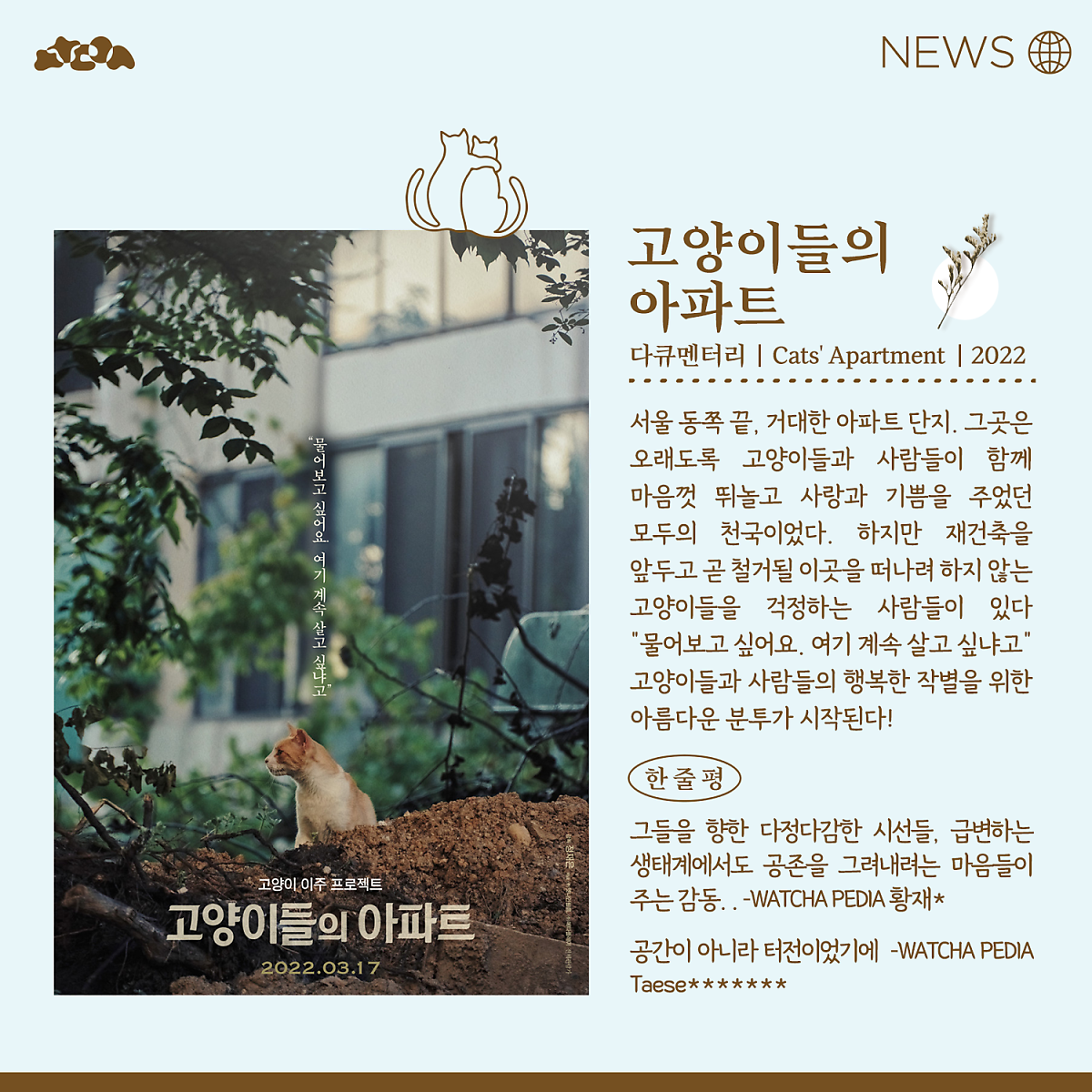 그들을 향한 다정다감한 시선들, 급변하는 생태계에서도 공존을 그려내려는 마음들이 주는 감동. . –WATCHA PEDIA 황재*