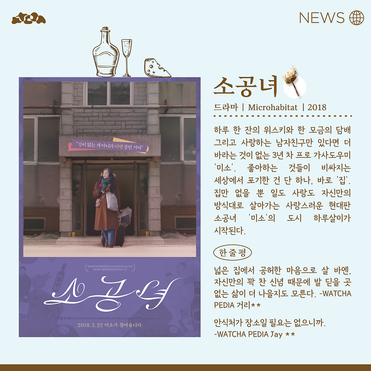 하루 한 잔의 위스키와 한 모금의 담배 그리고 사랑하는 남자친구만 있다면 더 바라는 것이 없는 3년 차 프로 가사도우미 ‘미소’. 좋아하는 것들이 비싸지는 세상에서 포기한 건 단 하나, 바로 ‘집’. 집만 없을 뿐 일도 사랑도 자신만의 방식대로 살아가는 사랑스러운 현대판 소공녀 ‘미소’의 도시 하루살이가 시작된다.