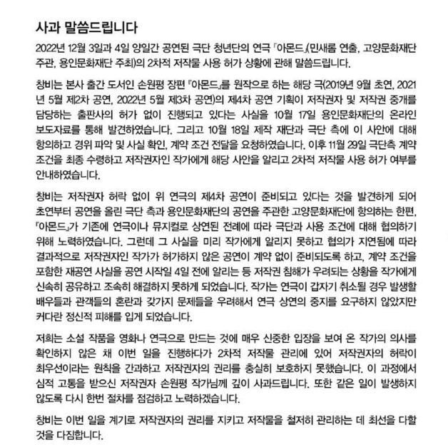해당 사건에 대한 출판사 창비의 입장문(출처=창비 인스타그램 등)