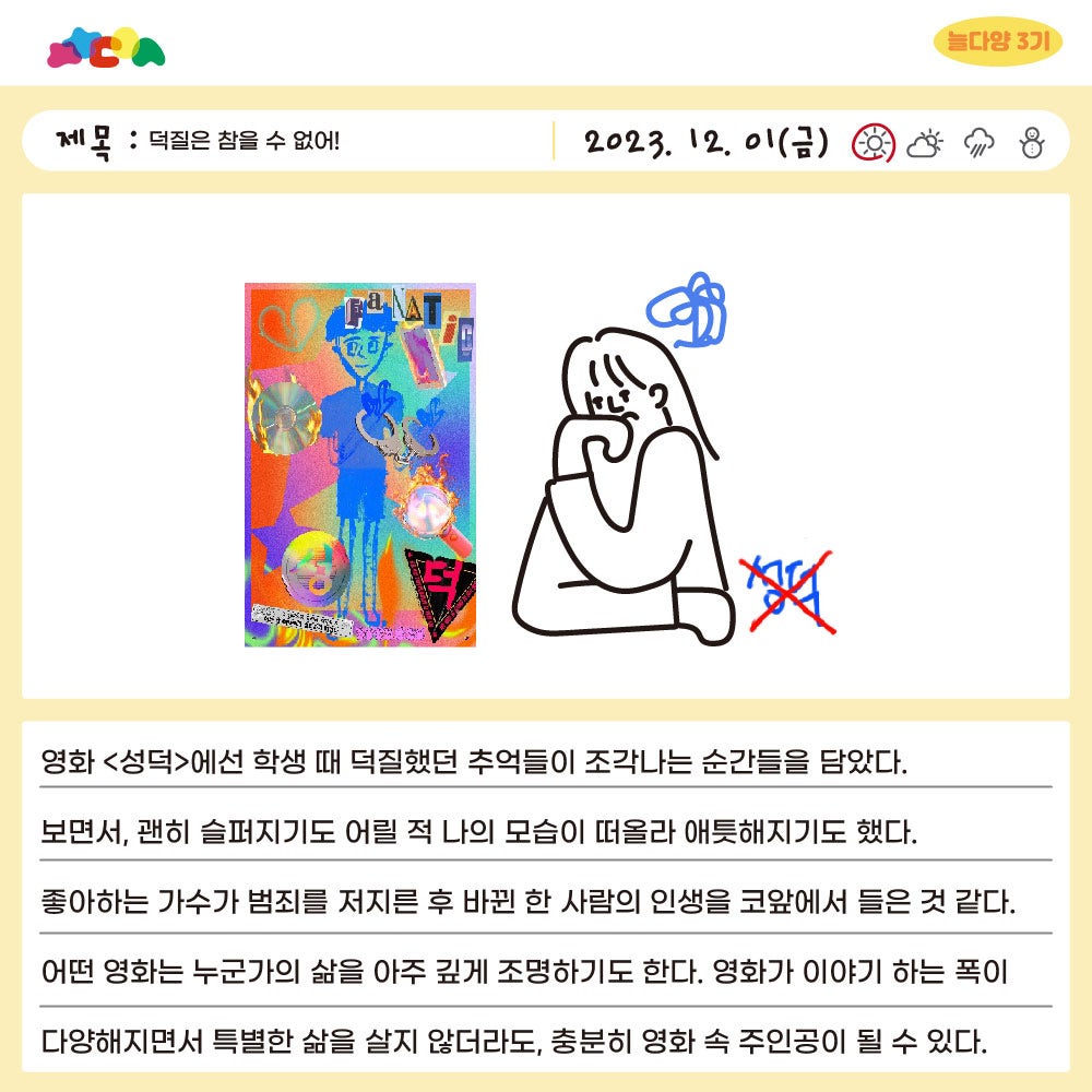 하지만, 내가 좋아하는 가수가 ‘범죄’에 연루된다면 그 사람을 사랑했던 사람들도 되려 마음이 불편해지며 과거의 자신을 부정하게 될 수도 있다. 바로 이 상황을 생생하게 담은 영화가 <성덕>이다.