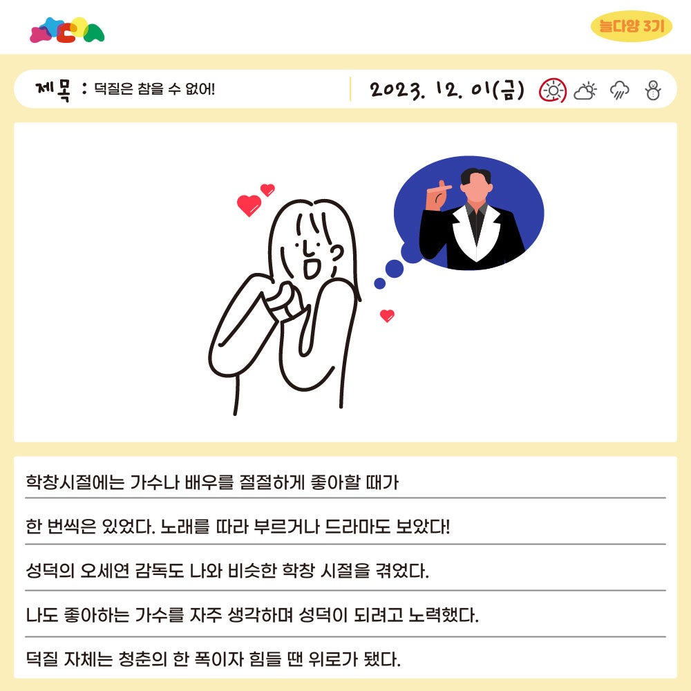 누구나 한 번쯤은 깊게 누군가를 좋아해 봤으리라 생각한다. 특히 학창 시절에는 열렬히 가수나 배우를 좋아하던 추억이 있다. 소위 말해 ‘덕질’을 하는 학생 팬들이 꽤 많았다. 2000년 후반은 아이돌과 가수들의 활동이 방송에서 활발했고, K-pop 팬덤 문화의 절정이었다. 그 나이엔 사랑하는 마음도 젊었다.